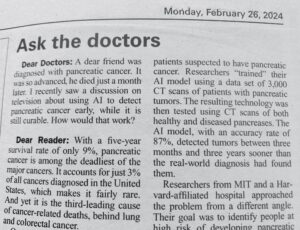 Artificial intelligence is here to stay. It is impressive that a machine can process such an amount of information and create something from it. We are overflowed with information. Concerning myself, I like to stay connected. Anyway, Americans seem to like AI and they do not seem afraid. I am very happy because I have had access to a real newspaper every morning. This morning a reader asked about AI, and how to use it to detect cancers at early stages (see below).