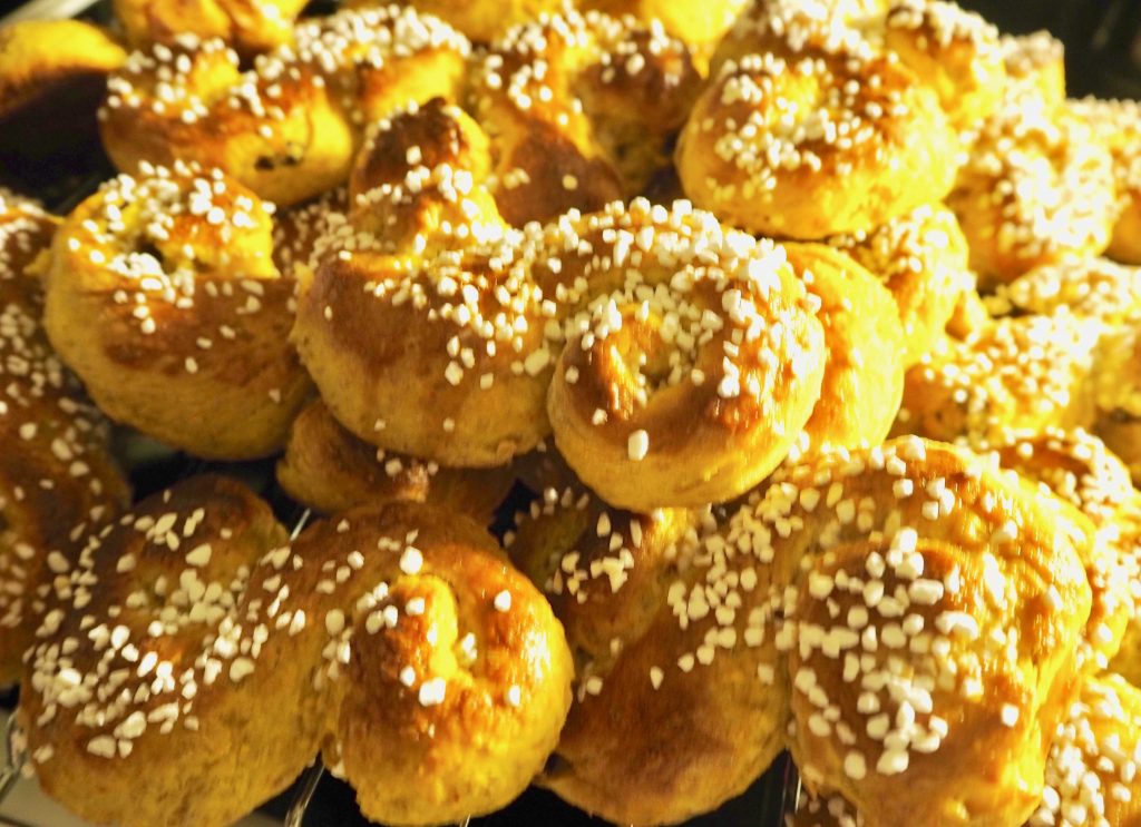 Nous sommes en Décembre et j’essaye de trouver un esprit de Noël. Hier soir, j’ai fait cuire des “lussekatter – des chats” avec du safran. Quand j’étais en France, nous faisons la cuisine pour Noël, mais c’était trop compliqué car je n’avais pas l’habitude d’un four à gaz. Difficile avec la température. Le résultat était beau à regarder mais beaucoup trop difficile à goûter. C’est devenu une décoration de Noël. Quand même. Je voudrais partager une photo des “lussekatter”, mais pour l’instant j’ai des problèmes avec l’ordinateur. Cependant, ces chats peuvent être mangés!