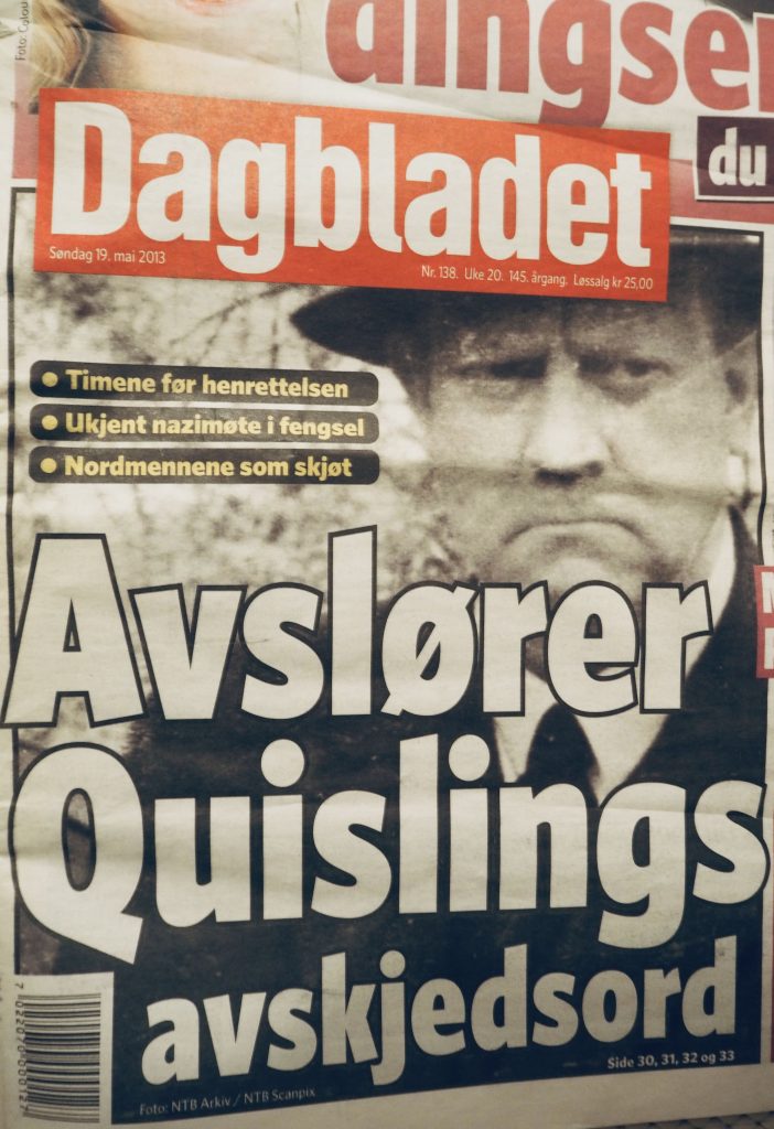 Noen ganger kjøpte jeg en dagsavis for å holde tritt med det daglige. Jeg ble overrasket over hvor skarpe og greie de noen ganger kunne skrive. Rett ut. Kanskje for å markere at det ikke må skje igjen. Det vil si krig. Det som skjedde under andre verdenskrig må ikke skje igjen. Har lagret noen magasiner, inkludert denne (se nedenfor). Fra historietimene på barneskolen husket jeg Qusiling. Vidkun Quisling ble skutt av norske politisoldater klokken 02.40 24 oktober 1945.